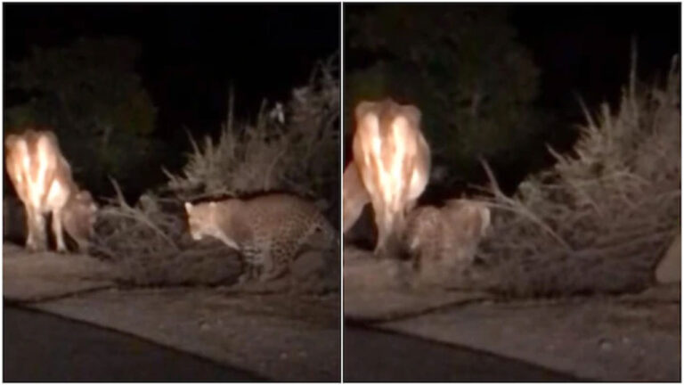 కారు హెడ్‌లైట్‌లు వెలుగుతున్నప్పుడు ఒక చిరుత ఆవుపైకి పరుగెత్తింది. చిరుత ఆవుకు హాని చేయకుండా వదిలేయడంపై నెటిజన్లు విస్మయం వ్యక్తం చేస్తున్నారు. చిరుత ఆవుకు ఆకలిగా లేకపోవడంతో దానిని వదిలేసిందని పలువురు నెటిజన్లు వ్యాఖ్యానించారు. ఫ్లాష్‌లైట్‌లు రెపరెపలాడుతుండగా చిరుత ఆవులను దాటి వెళ్లడంతో అందరూ ఊపిరి పీల్చుకున్నారు. ఇప్పటి వరకు ఈ వీడియోను 16,000 మందికి పైగా వీక్షించారు.