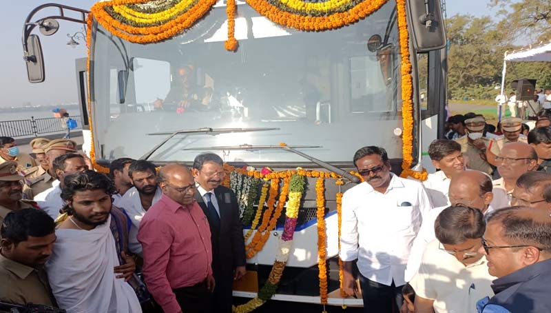 ప్రయాణికుల సౌకర్యాన్ని పెంపొందించేందుకు అత్యాధునిక సౌకర్యాలతో కూడిన టీఎస్ఆర్టీసీ నూతన అల్ట్రా లగ్జరీ బస్సుల ప్రారంభోత్సవం శనివారం హైదరాబాద్లోని ట్యాంక్బండ్లో జరిగింది. ఈ కొత్త అల్ట్రా లగ్జరీ బస్సులను చైర్మన్ బాజిరెడ్డి గోవర్ధన్, మేనేజింగ్ డైరెక్టర్ వీసీ సజ్జనార్ అధికారికంగా ప్రారంభించారు. అనంతరం బస్సులో ప్రయాణికులకు కల్పిస్తున్న సౌకర్యాలను పరిశీలించారు. సూపర్ లగ్జరీ బస్సు విశేషాలను అధికారులను అడిగి తెలుసుకున్నారు.