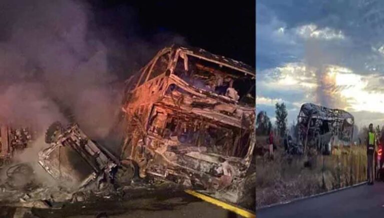 ప్రయాణికులతో వెళ్తున్న బస్సు, ట్రక్కు ఢీకొన్న ఘటనలో 19 మంది దుర్మరణం చెందారు. ఈ విషాద ఘటన మెక్సికోలో మంగళవారం జరిగింది. నార్త్ వెస్ట్రన్ సినాలోవా రాష్ట్రంలోని మజాట్లాన్-లాస్ మోచిస్ నగరాల మధ్య తిరుగుతున్న బస్సు కోస్టల్ హైవేపై ప్రయాణిస్తున్నక్రమంలో ప్రమాదానికి గురైంది. ఈ ప్రమాదంలో 19మంది మరణించగా.. మరో 22 మందికి గాయాలయ్యాయి. గాయపడిన వారిని చికిత్స నిమిత్తం స్థానిక ఆస్పత్రులకు తరలించారు. ప్రమాదం సమయంలో బస్సులో 37మంది ప్రయాణికులున్నట్లు అధికారులు తెలిపారు. బస్సు, ట్రక్కు ఢీకున్నవెంటనే బస్సులో మంటలు చెలరేగాయి, దాంతో బస్సు మంటల్లో పూర్తిగా దగ్దమైంది. ఈ ప్రమాదంతో హైవేపై వాహనాల రాకపోకలు నిలిచిపోయాయి. సమాచారమందుకున్న అధికారులు వెంటనే ఘటనాస్థలానికి చేరుకొని క్షతగాత్రులను ఆస్పత్రికి తరలించారు.