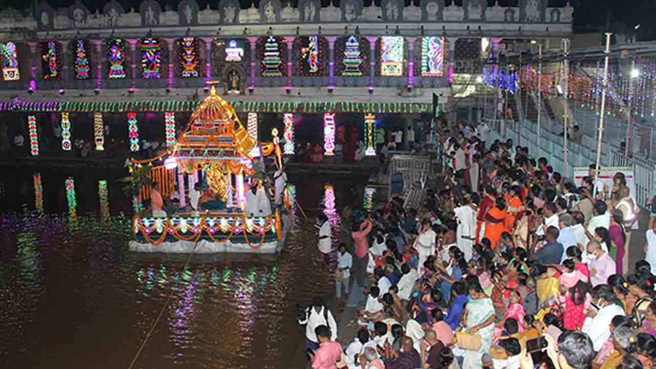 విద్యుత్ దీపాలతో సర్వాంగ సుందరంగా అలంకరించిన తెప్పపై స్వామి తన పుష్కరిణిపై తొమ్మిది ప్రదక్షిణలు చేశారు. భక్తులు స్వామివారికి కర్పూర నీరాజనాలు సమర్పించారు. ఈ సందర్భంగా ఆలయ డిప్యూటీ డైరెక్టర్ ఈవో దేవేంద్రబాబు, ఏఈవో పార్థసారథి, ఇతర అధికారులు, భక్తులు హాజరైన టీటీడీ అన్నమాచార్య ప్రాజెక్టు అలరించిన వారిచే భక్తిగీతాలు ఆలపించారు.