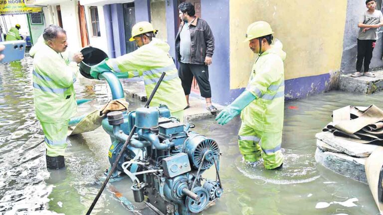 హైదరాబాద్ |పీయూసీ జూలై 21 (నమస్తే తెలంగాణ): బర్దియాకు భారీ వర్షం హెచ్చరిక జారీ చేశారు. విపత్తు సహాయక చర్యలు పెరుగుతూనే ఉన్నాయి. ప్రశ్నలకు వెంటనే స్పందించండి. బల్దియాకు 300 ఫిర్యాదులు అందగా 280 పరిష్కరించారు. సేకరణలో ప్రత్యేక కంట్రోల్ రూం కూడా ఏర్పాటు చేశారు. భారీ వర్షం కురుస్తున్న నేపథ్యంలో మంత్రి తలసాని శ్రీనివాస్యాదవ్ అధికారులను కాన్ఫరెన్స్ కాల్కు పిలిచి అప్రమత్తంగా ఉండాలని అధికారులను ఆదేశించారు. ప్రజలు అత్యవసర పరిస్థితుల్లో బల్దియా టోల్ఫ్రీ నంబర్ను ఉపయోగించాలని సూచించారు. వరద ప్రభావిత ప్రాంతాల్లో జీహెచ్ఎంసీ కమిషనర్ రోనాల్డ్ రాస్ పర్యటించి బాధితులకు భరోసా కల్పించారు. మల్లంపేటలోని బీహార్స్లం బస్తీలోని 50 కుటుంబాలను రెస్క్యూ టీమ్లు సురక్షిత ప్రాంతాలకు తరలించారు. నీరు, మురుగునీటి కలుషిత సమస్యలపై తక్షణమే స్పందించాలని, నీటి నాణ్యత పరీక్షలను రెట్టింపు చేయాలని దానకిషోర్ ఎండీ జల్ మండల్ అధికారులను ఆదేశించారు. తీవ్ర వరదల కారణంగా హిమాయత్ సాగర్ స్లూయిస్ను తెరిచి మూసీకి 700 క్యూబిక్ సెకన్ల నీటిని విడుదల చేస్తున్నారు. మరో మూడు రోజుల్లో భారీ వర్షాలు కురిసే అవకాశం ఉందని వాతావరణ శాఖ తెలిపింది. శుక్రవారం టోలిచౌకిలో 4.5సెం.మీ, గాజులరామారంలో 2.7సెం.మీ వర్షం కురిసింది.