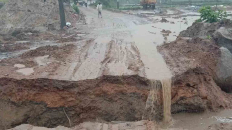 భారీ వర్షం |కామారెడ్డి జిల్లా రాజంపేట మండలం కొండాపూర్ గ్రామం మరియు ఎల్లారెడ్డిపల్లి గ్రామం మధ్య వర్షం కారణంగా రహదారి కోతకు గురైంది. దీంతో రెండు గ్రామాల మధ్య రాకపోకలు నిలిచిపోయాయి. పరిస్థితిని గమనించిన గ్రామస్థులు జలమండలి అధికారులకు సమాచారం అందించారు.