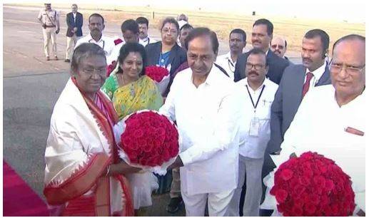అధ్యక్షురాలు ద్రౌపది ముర్ము పదవీ బాధ్యతలు చేపట్టిన తర్వాత తొలిసారిగా తెలంగాణకు వచ్చారు. ఈ నేపథ్యంలో హకీంపేట ఎయిర్‌ఫోర్స్‌ బేస్‌లో సీఎం కేసీఆర్‌ ఆమెకు స్వాగతం పలికారు. రాష్ట్రపతికి శాలువా కప్పి పుష్పగుచ్ఛం అందించారు. సీఎంతో పాటు రాష్ట్రపతి ముర్ములకు శాసనమండలి చైర్మన్ గుత్తా సుఖేందర్ రెడ్డి, స్పీకర్ పోచారం శ్రీనివాస్ రెడ్డి, జీహెచ్ ఎంసీ మేయర్ గద్వాల్ విజయలక్ష్మి, సీఎస్ సోమేశ్ కుమార్, డీజీపీ మహేందర్ రెడ్డి, ఆర్మీ, నేవీ అధికారులు స్వాగతం పలికారు. అనంతరం రాష్ట్రపతి గౌరవ వందనం స్వీకరించారు.