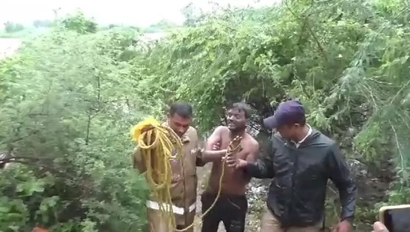 రాష్ట్రంలో ఎడతెరిపి లేకుండా కురుస్తున్న భారీ వర్షాలకు వాగులు, వంకలు పొంగి పొర్లుతున్నాయి. వరదలకు పలుచోట్ల రోడ్లు తెగిపోయి జనాలు తీవ్ర ఇబ్బందులు పడుతున్నారు. కాగా.. రాజన్న సిరిసిల్ల జిల్లాలో కురుస్తున్న భారీ వర్షాలకు వేములవాడ మూలవాగు ఉదృతంగా ప్రవహిస్తుంది. జగిత్యాల జిల్లాకు చెందిన మారుతి అనే వ్యక్తి వాగు వైపు వెళ్లి చెట్ల మధ్యలో చిక్కుకుపోయాడు. గమనించిన ఓ వ్యక్తి ఈ విషయాన్ని పోలీసులకు తెలియజేశాడు. వెంటనే వేములవాడ సీఐ కర్నాకర్ బ్లూ కోల్ట్ సిబ్బందితో ఘటనాస్థలానికి వచ్చి, బాధితుడిని తాడు సహాయంతో బయటకు తీసుకువచ్చారు. చికిత్స కోసం ఏరియా ఆసుపత్రికి తరలించారు. వర్షాలు ఎక్కువగా పడుతున్నందున ప్రజలు అప్రమత్తంగా ఉండాలని సీఐ సూచించారు.