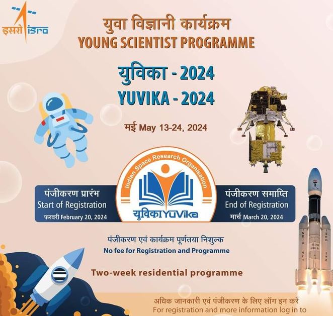 భారత అంతరిక్ష పరిశోధనా సంస్థ (ISRO) యువ శాస్త్రవేత్తలను తయారు చేసేందుకు కృషి చేస్తోంది. ఇందులో భాగంగా యువ శాస్త్రవేత్తలకు శిక్షణ ఇచ్చే కార్యక్రమంగా యువిక-2024 (యూత్ సైన్స్ ప్రోగ్రామ్)ను ప్రారంభించారు. ఈ అకాడమిక్ ఇయర్ లో దేశవ్యాప్తంగా 9వ తరగతి చదువుతున్న విద్యార్థుల నుంచి శిక్షణ కోసం దరఖాస్తులు ఆహ్వానిస్తున్నారు.