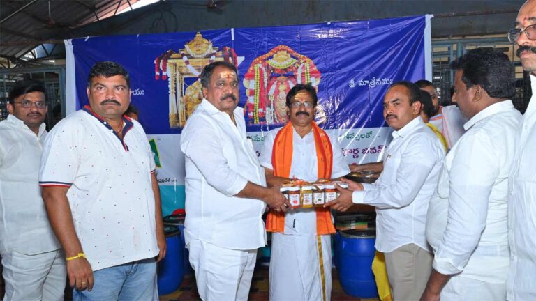 Srisailam | శ్రీశైల దేవస్ధానం భక్తుల సౌకర్యార్థం నిర్వహిస్తున్న అన్నదానానికి పచ్చళ్లను విరాళం ఇచ్చారు. గుంటూరు చిర్రావూరికి చెందిన విజయ ప్రొడక్షన్కు చెందిన కాటూరి రాము 2,040 కేజీల పచ్చళ్లను శ్రీశైల నియోజకవర్గ శాసనసభ్యులు శిల్పాచక్రపాణి రెడ్డి, ఈవో పెద్దిరాజుకు గురువారం అందించారు.