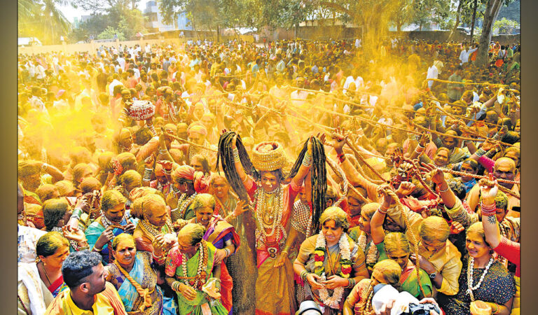 A vibrant tapestry of traditions unfolds within the temple’s precincts, with Oggu Katha singers narrating the saga of Mallanna. Devotees, guided by Oggu pujaris, worship Mallikarjuna Swamy by crafting intricate rangolis known as ‘patnam’.