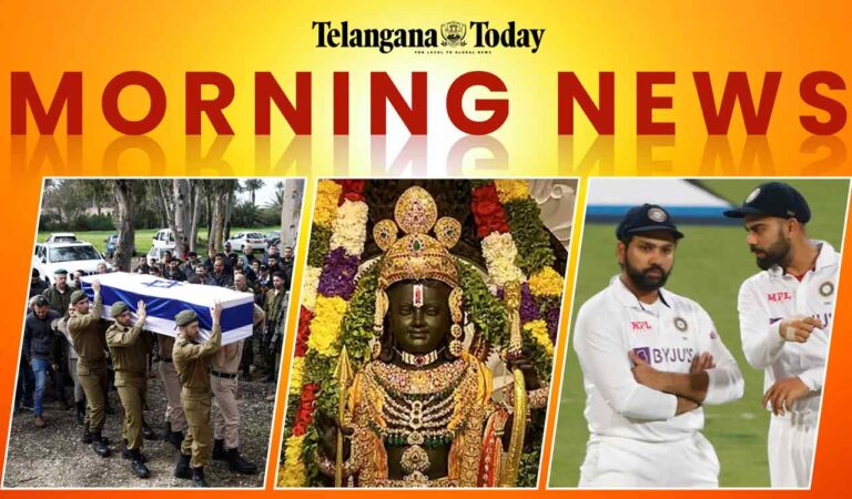 Morning News Today from Telangana Today brings you the latest news updates with headlines from our E-paper daily. Today’s morning news includes Ayodhya Ram Mandir flooding with rush, Israel’s absolute win over Hamas, and ICC awards for the year 2023.