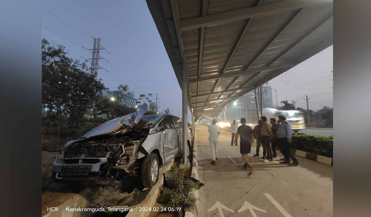 Hyderabad: A rashly driven car went out of control and crashed into the road median of the solar roof cycling track at Nanakramguda in the city on Saturday morning. No casualties were reported.