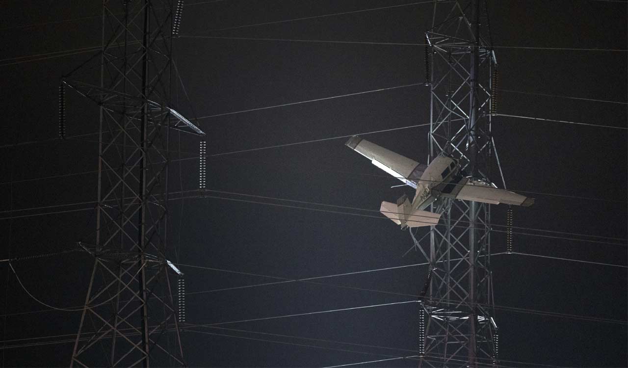 A small plane sits on a live power line after it crashed in Montgomery Village on the northern outskirts of Gaithersburg, Maryland, Sunday, Nov. 27, 2022.Photo: Associated Press