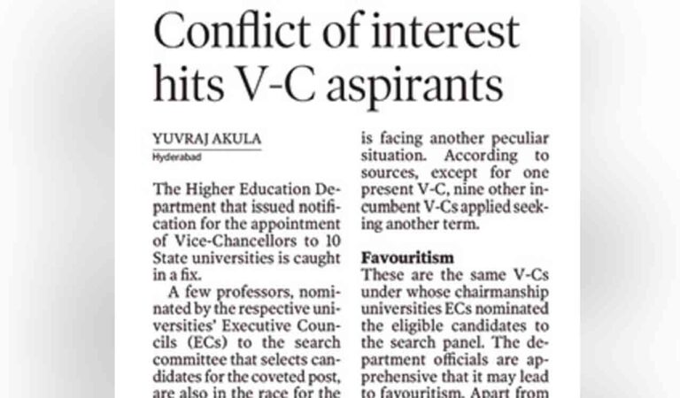 The report pointed out that representatives of the search committee are nominated by the Executive Councils (ECs) which are headed by the Vice-Chancellors. Incidentally, V-Cs who sent their nominees to the search panel, themselves were in the reckoning for selection, which is seen by many as a conflict of interest.
