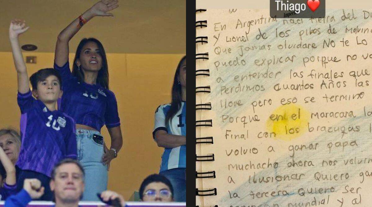 FIFA వరల్డ్ కప్: FIFA వరల్డ్ కప్ ఫైనల్స్లో అర్జెంటీనా గెలవాలని దేశవ్యాప్తంగా ప్రజలు కోరుకుంటున్నారు. ఆ జట్టు స్టార్ ప్లేయర్ లియోనెల్ మెస్సీకి ఇది రెండో ప్రపంచకప్ ఫైనల్. కాబట్టి, ఈసారి, అతని పదేళ్ల కుమారుడు థియాగో జట్టుకు ట్రోఫీని అందించాలని కోరుకుంటున్నాడు. అందుకే ఫైనల్ సందర్భంగా నాన్నకు మద్దతు తెలుపుతూ లేఖ రాశారు. ఇది అర్జెంటీనా థీమ్ సాంగ్ ముచాచోస్ నుండి కొన్ని సాహిత్యాన్ని కలిగి ఉంది. ఈ లేఖను మెస్సీ భార్య ఆంటోనెల్లా రోకుజో ఇన్స్టాగ్రామ్ కథనంలో పంచుకున్నారు. ‘అబ్బాయిలారా.. ట్రోఫీ గెలిచే అవకాశం ఇంకా ఉంది’ అని థియాగో లేఖలో రాశాడు. క్రొయేషియాపై 3-0తో సెమీఫైనల్ విజయం సాధించిన తర్వాత అర్జెంటీనా ఆటగాళ్లు ముచాచోస్ అంటూ సంబరాలు చేసుకున్నారు. వీడియో కూడా తీశారు.