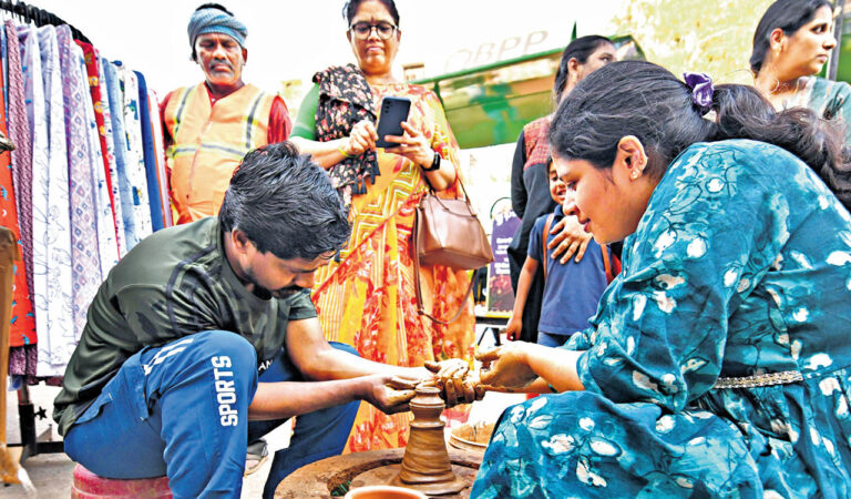 Hyderabad’s Numaish hosts an interactive pottery-making stall, promoting financial independence and awareness among artisans. Supported by Khadi and Village Industries Commission, 500 electric pottery wheels were distributed and a skill development program was implemented.