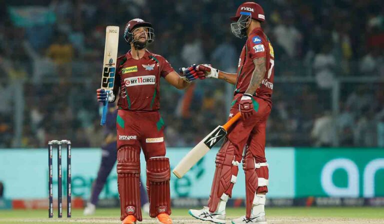 గత ఐపీఎల్ గేమ్లో ఓడిపోయిన లక్నో ఆరంభం సరిగా లేదు. ఓపెనర్ కరణ్ శర్మ (3) షార్ట్ అవుట్ అయ్యాడు. ఆ తర్వాత ఒకే ఓవర్లో ప్రేరక్ మన్కడ్ (26), మార్కస్ స్టోయినిస్ (0)లను వైభవ్ అరోరా తప్పించాడు. కష్టాల్లో పడిన లక్నోకు కెప్టెన్ కృనాల్ పాండ్యా (9), క్వింటన్ డి కాక్ (28) సహకరించారు. వారు ఔట్ అయిన తర్వాత, పౌలాన్ మరియు బర్డోనీ గేమ్ను కొనసాగించారు.