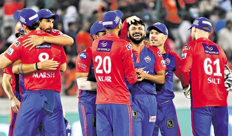 Delhi Capitals celebrate after defeating Sunrisers Hyderabad at the Rajivgan Floor Stadium in Hyderabad. — Photo: Anand Dharmana