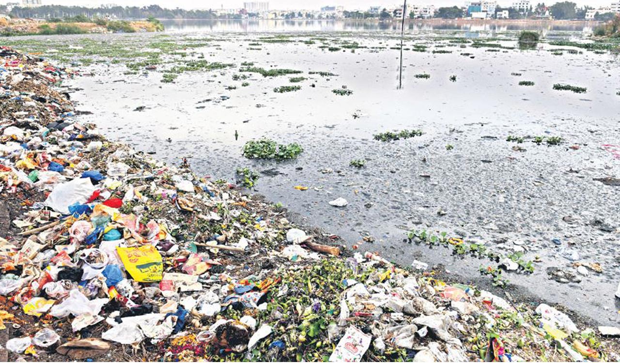 Hyderabad: Saroornagar lake, once a serene oasis, now cries out for attention as it grapples with a mounting problem – the lake has partly transformed into a floating dump.