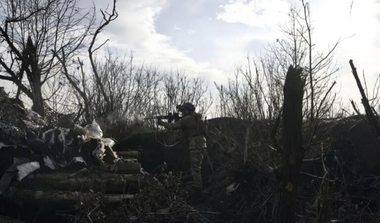 A Ukrainian soldier opens fire on Russian positions on the front line near Malinka in Ukraine’s Donetsk region (AP Photo)