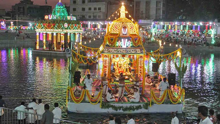 తిరుపతి : తిరుపతి శ్రీ గోవిందరాజస్వామి (Govindarajaswamy) వారి తెప్పోత్సవాలు శనివారం వైభవంగా ప్రారంభమయ్యాయి. ఏడు రోజుల పాటు జరుగనున్న ఈ తెప్పోత్సవాల్లో శనివారం రాత్రి 6.30 నుంచి 8 గంటల వరకు శ్రీ కోదండరామస్వామి( Kodandaramaswamy) వారు తెప్పపై విహరించి భక్తులకు దర్శనమిచ్చారు. అనంతరం ఆలయ నాలుగు మాడ వీధుల్లో ఊరేగి భక్తులను అనుగ్రహించారు.