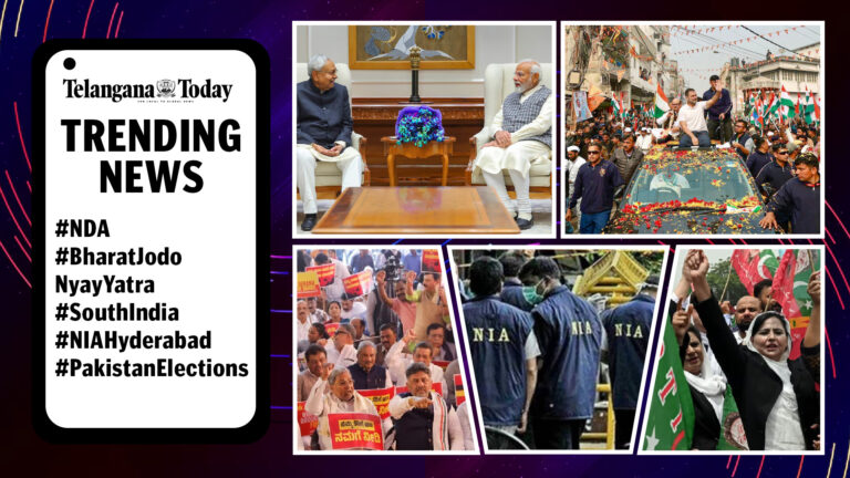 Today’s Trending News includes Nitish Kumar’s commitment to the NDA, Rahul Gandhi’s Bharat Jodo Yatra in Chhattisgarh, South India fund issues, NIA Hyderabad searching for Maoists, and Pakistan Elections 2024.